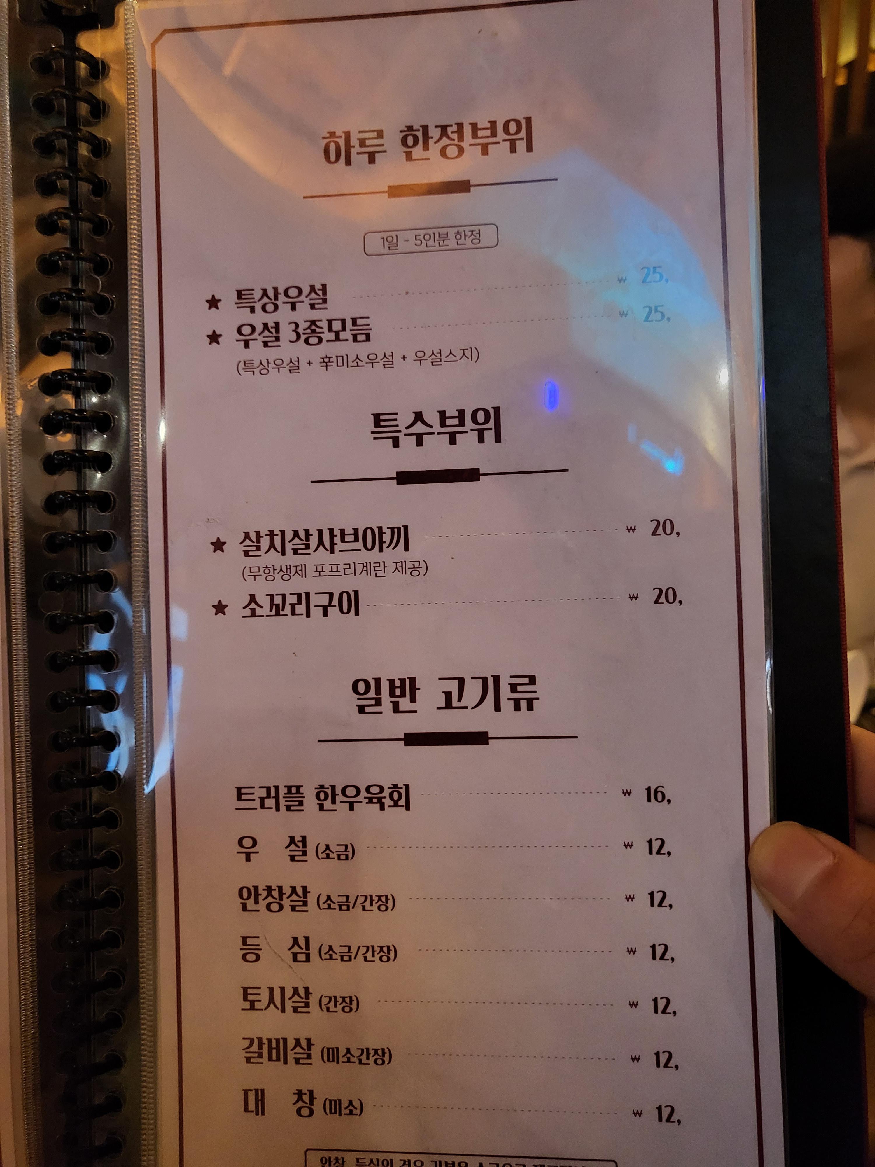 아래부터 우설, 안창, 등심, 토시, 갈비, 대창.