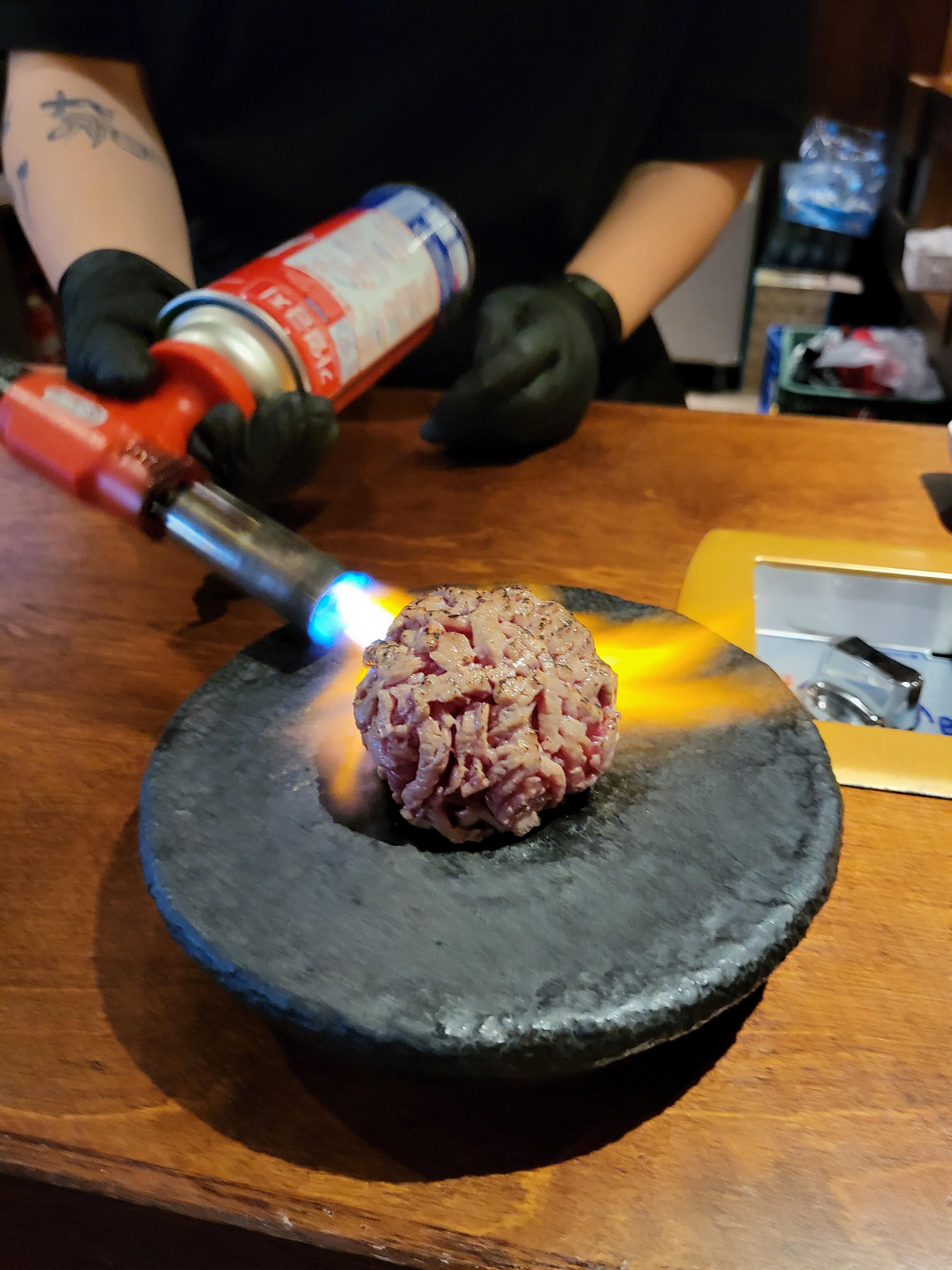육회는 토치로 겉부분을 한번 익혀주셨어요.