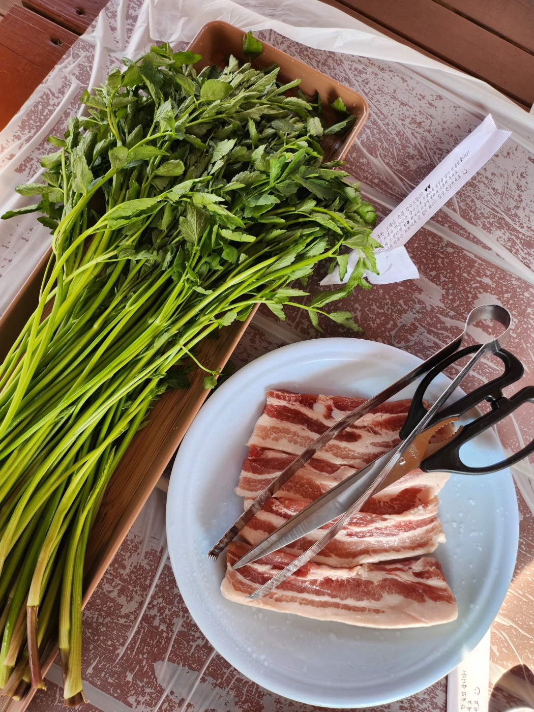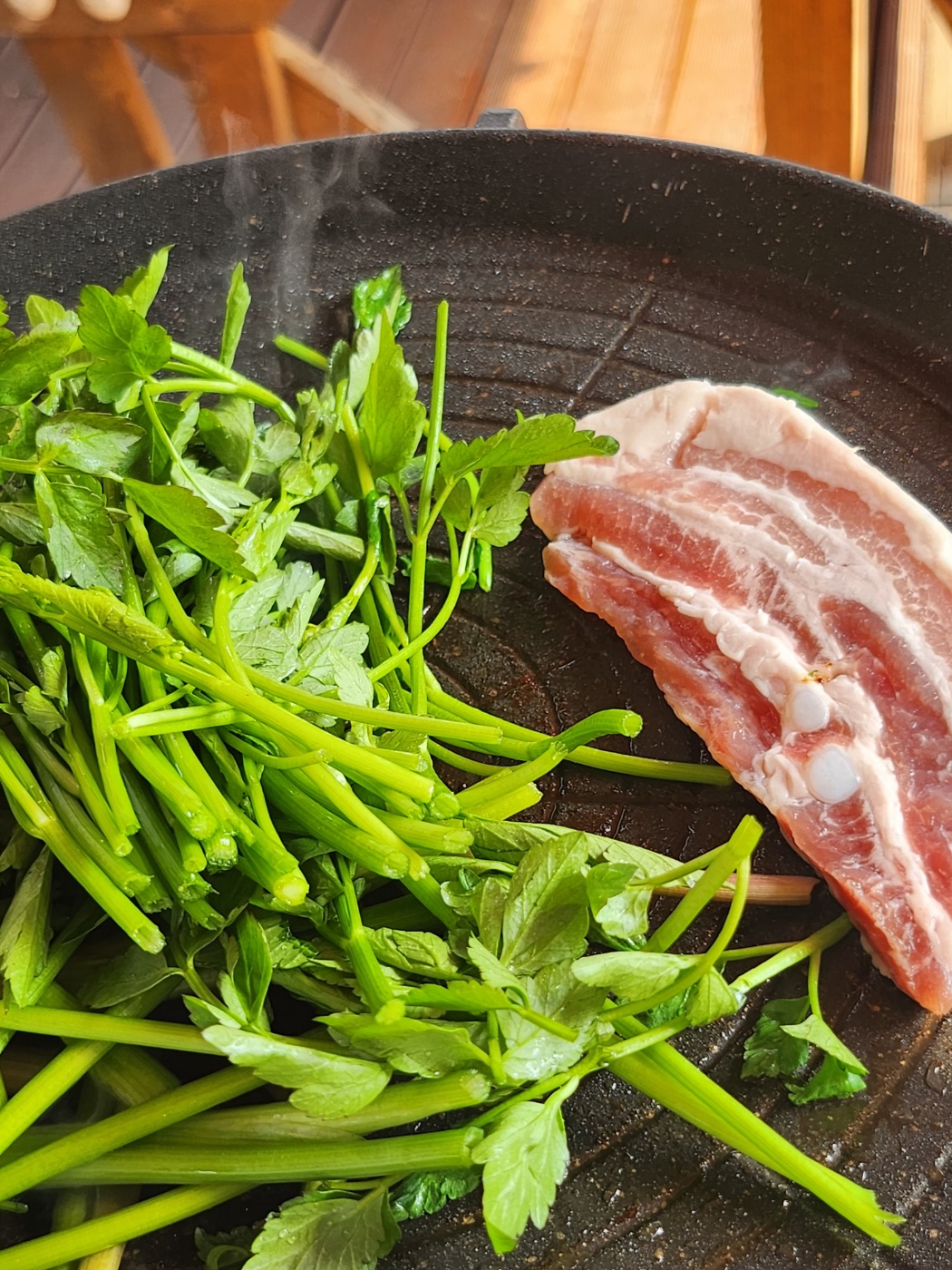 미나리향에 삼겹살 기름이 베여
